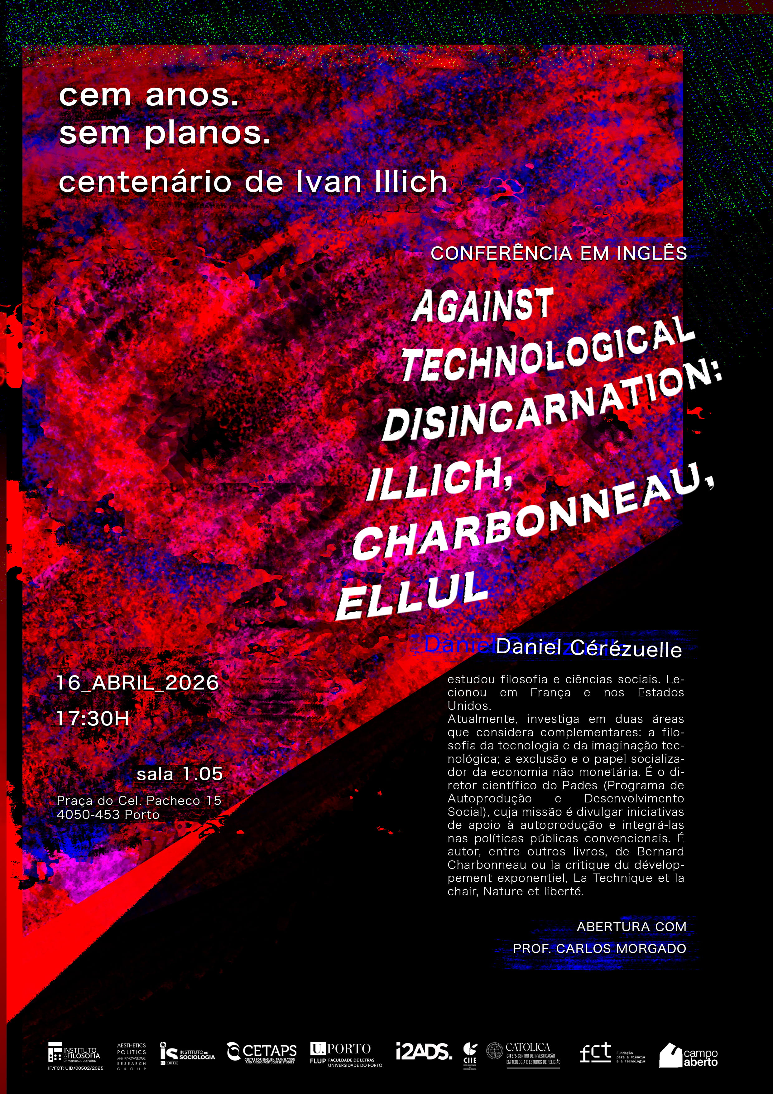 A conferência de abertura, já no próximo dia 16, às 17h30, será pronunciada (em inglês) por Daniel Cérézuelle, tendo por título: «Contra a Desencarnação Tecnológica: Illich, Charbonneau, Ellul».